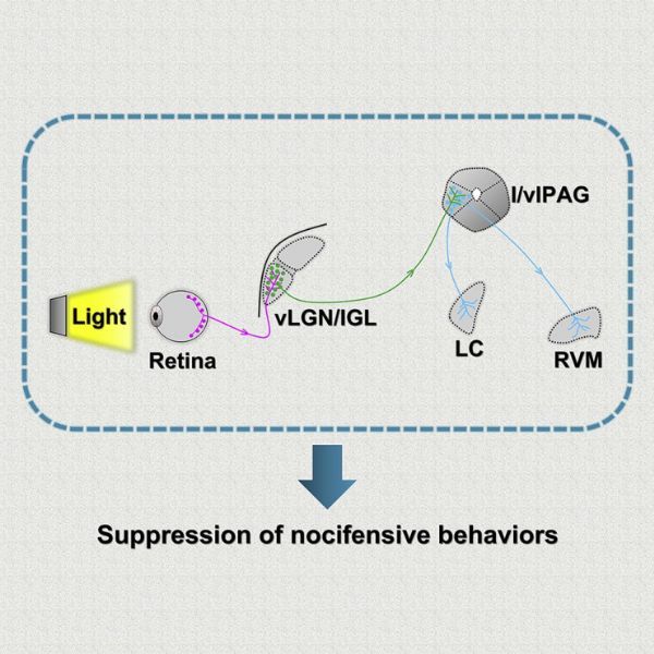 该研究发现,强光照射条件下,小鼠视网膜(retina)内部分光反应型神经节细胞(retinal ganglion cells, RGCs)可直接投射至腹侧外膝体(ventral lateral geniculate nucleus and intergeniculate leaflet, vLGN/IGL)内的γ-氨基丁酸(GABA)能神经元,而后者又可通过直接投射抑制外侧及腹外侧中央导水管周围灰质(lateral and ventral lateral parts of the periaqueductal gray area,l/vlPAG)内GABA能神经元的活动,进而调节蓝斑(locus coeruleus, LC)及延髓头端腹内侧区(rostral ventromedial medulla, RVM)等疼痛相关脑区。特异性激活vLGN/IGL—l/vlPAG通路,可提升野生型小鼠痛阈,并显着改善炎症性疼痛及病理性疼痛模型小鼠的疼痛症状。